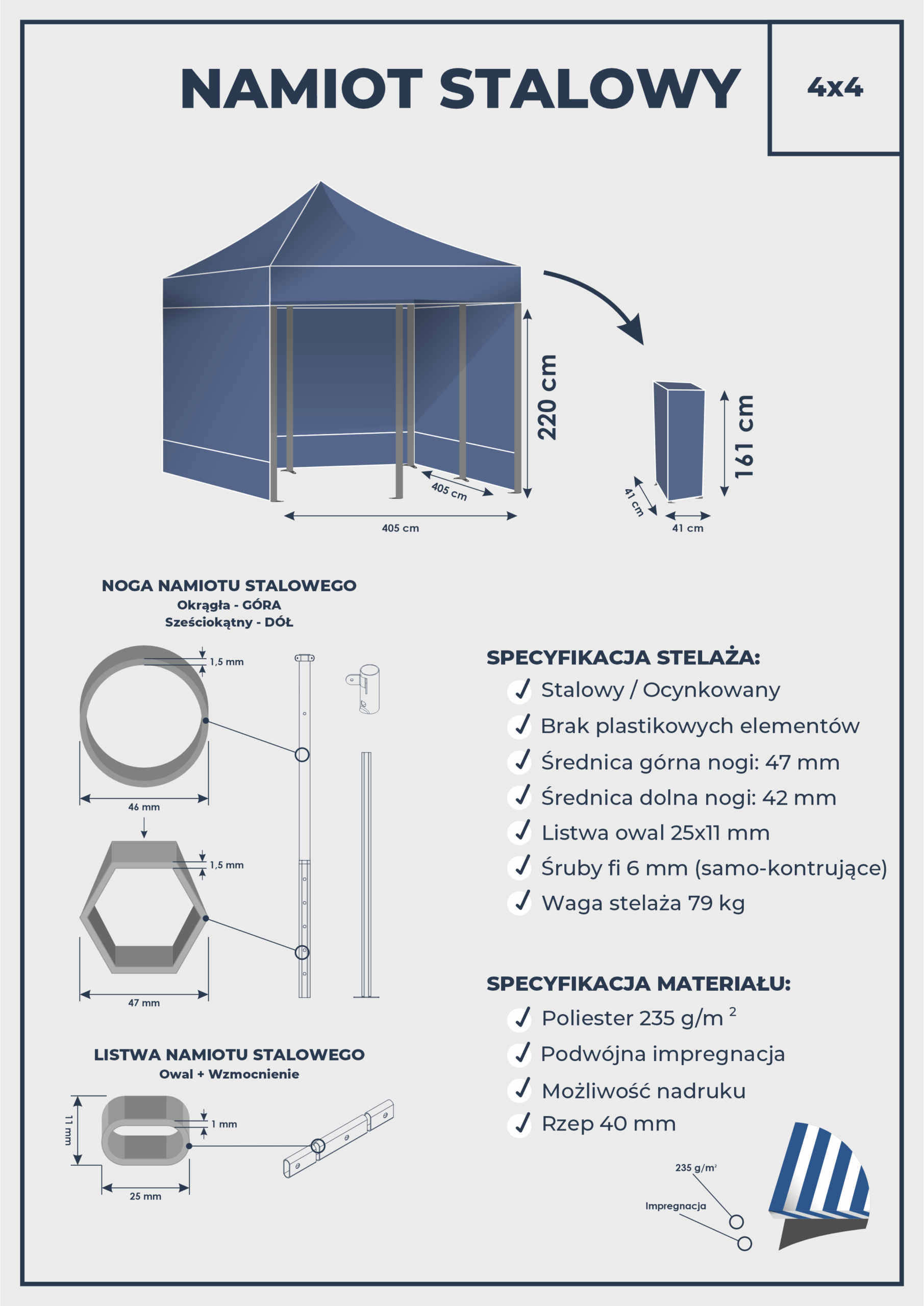 – Tkanina poliestrowa 235 g/m², 300 cm słupa wody